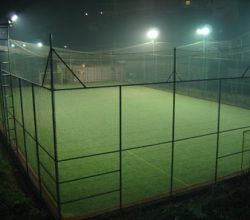 - Tel örgü gerdirilip bağlantıları yapıldıktan sonra, saha uzun kenarına 4, kale arkalarına 5 sıra gelecek şekilde 5 mm çelik halat gerdirilir, daha sonra gerdirilen çelik halatlar klemenslerle sabitlenir.